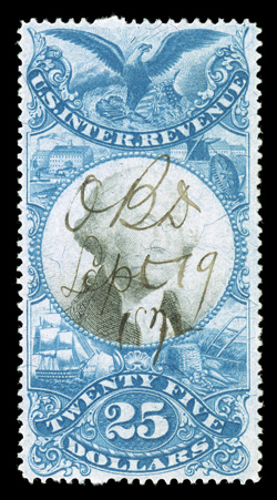 637 O R130 R130, $25.00 Blue and black, excellent centering within large margins, wonderfully bright and fresh, light 1872 ms. cancel, extremely fine.#R130, $25.00 Blue and black, excellent centering within large margins, wonderfully bright and fresh, light 1872 ms. cancel, extremely fine. (Image) $900.00