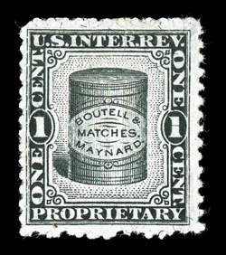spot and light vertical crease at center, extremely fine appearance#RO11a, American Match Co., 3c Black, a select example of this very scarce stamp, remarkably well centered, rich color and sharp impression on clean white paper, shallow thinned spot and light vertical crease at center, extremely fine appearance; only 31 examples recorded in the Aldrich census. (Image) $550.00