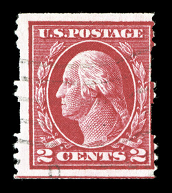 each, lightly cancelled, very good these compound private perforations s#409, 484, 2c Carmine imperforate, Ty. I and 3c Violet imperforate, Ty. II, Schermack Ty. III perforations and private gauge 13 perforations, extremely rare used singles of each, lightly cancelled, very good; these compound private perforations still remain enigmatic, however George P. Howard probably offers us the best explanation when he writes: "With no facts to substantiate my theory, I should like to suggest that these were Schermack coils to which the 13-gauge perforations were added. It would then be possible to tear stamps from the coil, or to use the coil in a machine which separated the stamps by means of the perforation. Since Mail-om-eter could not handle a cover of more than 5 inches in width, to mail any larger envelope it would be necessary to apply the stamps by hand or with a small hand machine. Most of these, such as Standard Mailing Machine, operated by tearing the stamp from the coil at the perforations..Then too, it might be that certain users discarded their Mail-om-eters for machines using Bureau coils, and had their remaining Schermack coils perforated for use in the other machines. It is even possible that the Maiometer branch in New York at various times corrected the feeding fingers in use to adapt them to Bureau coils, and reperforated whatever coils the user had on hand." Accompanied by Ken Lawrence's American Philatelist article on these coils; ex-Ken Lawrence. (imagea) (Image) Est. $750-1,000