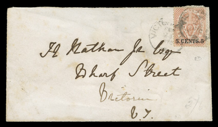 fine.#9, 1869 "5. Cents. 5" surcharge on 3p Bright red, perf. 14, nicely centered single tied to cover to Victoria by "Victoria/Sep 24, 1870" c.d.s. struck twice, flap missing, fine. (Image) $575.00