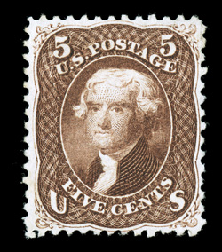 color that is unusually deep and luxuriant, razor-sharp impression, l#75, 5c Red brown, a most impressive used example of one of the most difficult 19th Century stamps to find in any kind of premium quality, incredibly well centered, outstanding color that is unusually deep and luxuriant, razor-sharp impression, light grid cancel, extremely fine; a rare stamp in this choice condition; 1987 PF certificate. (Image) $600.00
