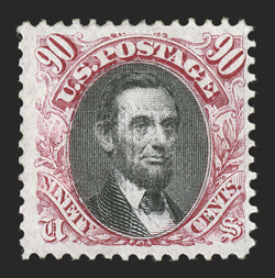 appearance.#122, 90c Carmine and black, used, remarkably well centered within larger margins than normal, bright and fresh, segmented cork cancel, shallow thinned spot, extremely fine appearance. (Image) $2,250.00