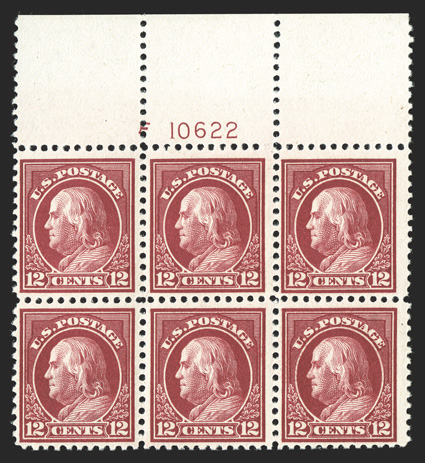 choice very fine.#512, 12c Claret brown, right margin plate no. 10622 block of six, uncommonly well centered, luxuriant rich color on fresh white paper, o.g., l.h., bottom four stamps n.h., choice very fine. (Image) $150.00