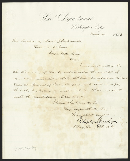 Confederate troops to retreat to Texas commanded New York after the DraIowa Volunteers: ERS Canby American soldier (1817-73); after serving with honor in the Mexican-American War, commanded the Department of New Mexico in the Civil War, forcing Confederate troops to retreat to Texas; commanded New York after the Draft Riots; accepted surrenders of Taylor and Kirby Smith at the close of the war; later killed by Modocs while on a peace commission, making him the only American general killed in the Indian Wars. Interesting Manuscript Letter Signed "Ed. R.S. Canby / Brig. Gen. AAG," 1 page, 4to, on engraved War Department stationery, Washington, May 21, 1863. Canby writes Governor Samuel J. Kirkwood of Iowa, "I am instructed by the Secretary of War to acknowledge the receipt of your communication...in relation to certain companies of Iowa Troops, and to state in reply that the proposed arrangement is not consistent with the condition of the service." Light but extensive foxing to center and right edge, otherwise VG. Most likely Governor Kirkwood had sought to have Iowa troops stationed in their home state. (Image) Est. $750-1,000