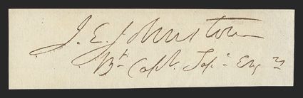 Robert E Lee took charge best known for his long strategic withdraJohnston, Joseph E. American general (1807-91); the highest-ranking US officer to join the Confederacy; first commander of the Army of Northern Virginia until he was wounded and Robert E Lee took charge; best known for his long strategic withdrawal against WT Sherman's army in Georgia; after the war, the two rivals became friends, and Johnston died after catching a cold at Sherman's funeral. Very early clipped Signature "J.E. Johnston / Bt. Capt Top'l Engrs." on a1.3" x 4.25" sheet, undated but ca. 1840. Johnston had been brevetted for his valor in the Second Seminole War in Florida, where in 1838 he had been wounded during a stint as a civilian. In VG/F condition. (Image) Est. $200-300