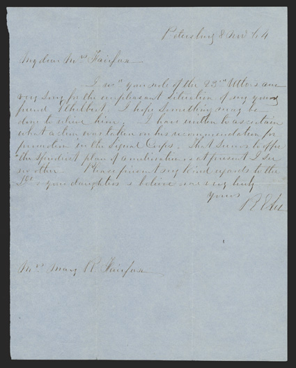 the model of the perfect soldier, he was offered the highest field comLee, Robert E. American general (1807-70); his remarkable success leading Confederate troops in the US Civil War made him a legend in his own day; known even before the war as the model of the perfect soldier, he was offered the highest field command by both sides at the start of hostilities. Outstanding war-date Autograph Letter Signed "R.E. Lee," 1/2 page, 4to, on blue paper, Petersburg, November 8, 1864. He writes Mrs. Mary R. Fairfax in Richmond in response to her letter on a promotion for her son, "I...am very sorry for the unpleasant situation of my young friend Ethelbert. I hope something may be done to relieve him. I have written to ascertain what action was taken on his recommendation for promotion in the Signal Corps. That seems to offer the speediest plan of amelioration, & at present I see no other. Please present my kind regard to the Dr. & your daughters." Folds, toning, small pieces of silk on verso to reinforce folds, sharp and VG. The Fairfaxes' son Randolph had been killed at Fredericksburg in December 1862, and on that occasion, General Lee had written a moving letter of condolence. Lee had always taken great care to avoid interfering in the careers of even his closest friends, on the principle that merit alone should dictate military promotions - something that gave the Confederacy an early advantage against Union armies studded with incompetent political appointments. Here we see that principle in action, as Lee promises only to see what action was taken, avoiding any suggestion that he will intervene on Ethelbert Fairfax's behalf. Fairfax had begun in the heavy artillery before being transferred to the Signal Corps. Though it was not a combat assignment, serving in the Signal Corps was extremely dangerous, as much of its work was done close to enemy forces, and sometimes even behind their lines. Disrupting enemy communications was a high priority for both sides. Indeed, despite his mother's pleas, Ethelbert would be shot in the lung in 1865, but he would survive the war, dying in 1907. Accompanied by its highly desirable Autograph Postal Cover Franked "R.E. Lee / Genl." in upper right corner. Lee addresses his letter to "Mrs. Fairfax / Care of Dr. Orlando Fairfax / Richmond / Virginia." With Confederate ten-cent stamp at right, with light circular Petersburg postmark. Toned but VF. General Lee did not have a franking privilege in the Confederate Army, but he continued the practice from his time in the US Army, adding the appropriate postage. Only 15 of these field-endorsed letters that traveled through the Confederate postal system are known to exist, making this an exceptional rarity! [2] (imagea) (Image) Est. $20,000-30,000