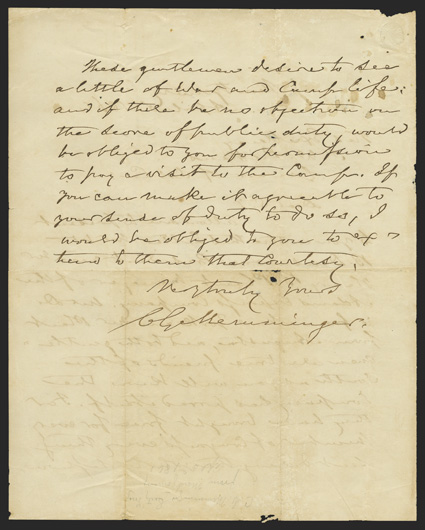 committee that drafted the Confederate constitution named the ConfederaMemminger, Christopher G. German-born American politician (1803-88); a lawyer and South Carolina legislator, he was in the provisional Confederate congress and was among the committee that drafted the Confederate constitution; named the Confederacy's first Secretary of the Treasury, facing the impossible task of financing a terrible war against a larger, richer, more industrialized foe. Choice content Autograph Letter Signed "C.G. Memminger" as provisional secretary of the treasury, 1-1/2 pages, 4to, on paper watermarked "Alexr. Piries Sons / 1859," at the temporary capital, Montgomery, AL, April 5, 1861. Memminger writes to Governor F.W. Pickens of South Carolina, presenting "Mr. W.B. Dinsmore, President and Mr. Henry B. Plant, Manager of the Adams Express Company. Mr. D. is from New York and Mr. Plant from Augusta, and both gentlemen are true friends of the South and as you well know the company has proved itself. For they have brought free for every member of Congress everything sent during the whole session. These gentlemen desire to see a little War and Camp Life and...would be obliged to you for permission to pay a visit tot he Camp..." Edge and fold wear, with several small holes not affecting legibility, but overall VG. At the outbreak of the Civil War, Adams Express already transported freight throughout the South. In order to continue doing business, the company formed Southern Express, headed by the very Henry Plant named in this letter! Throughout the war, Adams Express pretended that Southern was a separate, offshoot company, though in reality it was merely a subsidiary, allowing Adams to maintain national coverage. (Image) Est. $600-750