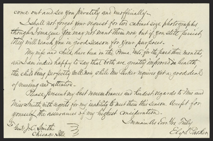 Grant, serving at Vicksburg became Grants military secretary and penneParker, Ely S. Native American Union general (1828-95); began as a representative of the Seneca nation to the US government; gained a military commission with the help of US Grant, serving at Vicksburg; became Grant's military secretary and penned the final draft of Lee's surrender at Appomattox; named Commissioner of Indian Affairs in 1869, the first Native American to hold that post. Autograph Letter Signed "Ely S. Parker," 3 full pages, 8vo, New York, August 16, 1889. He writes to his colleague, Gen. John C. Smith, lieutenant governor of Illinois and prominent Freemason, who has invited him to "be the guest of the M.W. Grand Lodge of Illinois of F. and A.M...I have labored increasingly all this summer to bring about such a turn in my affairs as would enable me finally to send you the message 'Yes, I will come.' My trouble of course is principally financial...At times I am very much discouaged at the perverseness of my fortunes...I am, and for some time past have been, a non-affiliated mason for non-payment of dues...Please do not humiliate me by again renewing the invitation. No one here knows of my troubles, and I have told it to you now in strict masonic confidence...I shall get through it in time....When I am myself once more, I shall be most happy to come out to see you." With original envelope. In VG condition. Parker had made a small fortune in the stock market only to lose it when his luck ran out; he had since been working for the NYC Police Department. (Image) Est. $750-1,000
