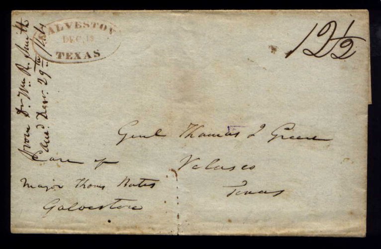 1 c imageGALVESTON/DEC, 13/TEXAS red oval handstamp on 1844 folded letter, rated with manuscript 12 1/2 for less than 100 miles transit, addressed to "Genl Thomas J. Greene, Velasco, Texas", General Greene was second in command of the disasterous Mier Expedition of 1842, when a retaliatory foray into Mexico by a Republic of Texas force ended in disaster, 1 out of every 10 captured Texans was executed by the draw of a black bean in the infamous "Black Bean Lottery", having escaped execution, Greene returned to Texas and served in the Texas Congress, trivial edge tear at bottom, very fine for this; an interesting item of Republic of Texas significance; ex-Camina. (Image) Est. 300-400