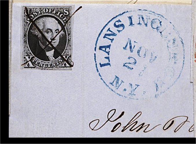 12 c 2 image#2, 10c Black, margins ranging from just cutting at two points to mostly large elsewhere, exceptional impression and color, tied to blue colored 1850 folded entire by manuscript "X" cancel, mostly clear "Lansingburgh, N.Y./Nov 21" c.d.s. immediately to right of stamp, addressed to Grand Rapids, Michigan, a fresh and fine small town usage of the Ten Cent 1847 issue; according to the newly published The United States 1847 Issue: A Cover Census by Thomas J. Alexander, there are no recorded Ten Cent covers from Lansingburgh, despite 100 examples having been sent to its Post Office (this cover being from an old estate was not available to the author for his remarkably detailed census). (Image) 1,750.00