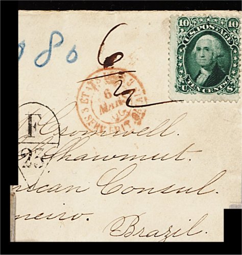 2 c imageSmall U.S. postal history balance of six 1829-71 covers, all but one sent overseas, nice destinations include Spain, Brazil, Barbados, Germany and England, many nice frankings, ship and due markings, some minor faults, however generally fine; an interesting lot worth examination. (Image) Est. 300-400