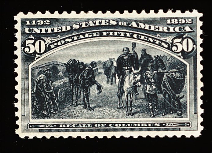 270 nh 240 image#240, 50c Columbian, an exciting mint example, being one of the very few gem quality, never hinged, Fifty Cent Columbians we have ever offered, as this value is surprisingly elusive in a true "post office" fresh state, with this particular copy boasting an incredible overall mint "bloom", deep luxuriant color and a razor-sharp impression on immaculate untoned paper, precisely centered as well, with full crisp and intact perforations all around, unblemished o.g. that is completely free of any gum bends or skips, never hinged, an extremely fine gem for the perfectionist; 2001 PF certificate. (Image) 1,200.00
