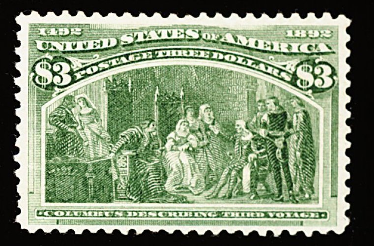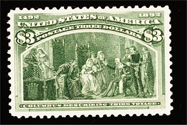 280 O 243a image#243a, $3.00 Columbian, the olive green shade, especially well centered within unusually large margins, deep luxuriant color, unobtrusive New York registry pmk. and a bit of a blue crayon cancel at left, extremely fine; 1999 PF certificate. (Image) 1,000.00