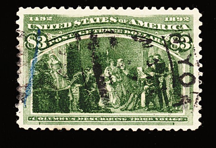 279 O 243a image#243a, $3.00 Columbian, the olive green shade, an extraordinary quality used example which possesses tremendous eye appeal, boasting uncharacteristically large margins and being wonderfully well centered within them, deep luxuriant color and impression on fresh paper (couple of very light offset lines on reverse from original cover), very light cancel confined to top right corner, extremely fine; a terribly challenging stamp to find so choice used; 1990 PF certificate. (Image) 1,000.00