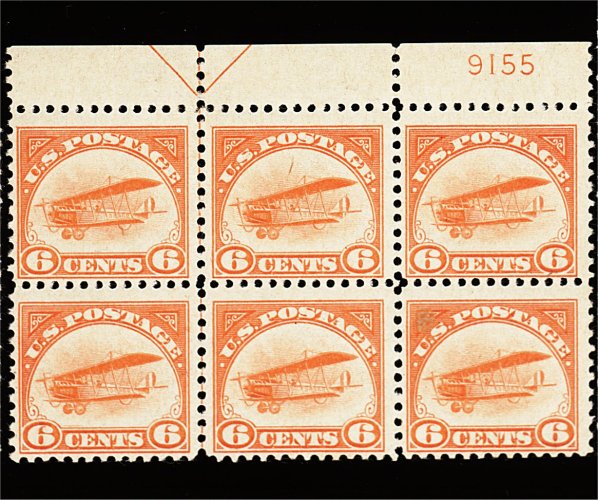 607 ogX C1 image#C1, 6c Orange, top margin arrow and plate no. 9155 block of six, unusually vibrant color and quite fresh overall, o.g., l.h. on two stamps, rest n.h., bottom right stamp with small translucent spot, fine-very fine. (Image) 800.00