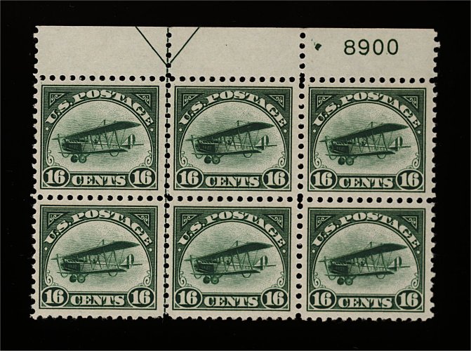 611 nhX C2 image#C2, 16c Green, full top margin arrow and plate no. 8900 block of six, unusually bright and fresh, deep rich color, exceptionally well centered, o.g., n.h., one stamp with tiny natural gum skip, very fine; an especially scarce plate block in this premium condition. (Image) 1,650.00