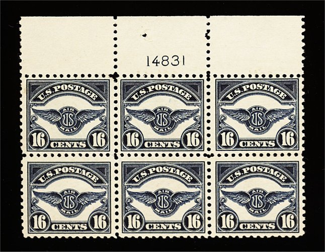 620 ogX C5 image#C5, 16c Dark blue, full top margin plate no. 14831 block of six, rather well centered, deep rich color, o.g. which has been slightly mount disturbed, fine-very fine. (Image) 1,900.00