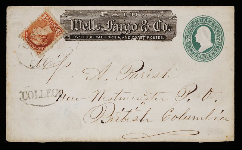944 c 37 image#37, 1873 3c Orange, Montreal printing, tied by oval "Barnard's / Cariboo / Express" h.s. on "Wells, Fargo & Co. / Paid" 3c U.S. stationery envelope to New Westminster, British Columbia showing oval "Wells, Fargo & Co. / San Francisco" d.s. (May 10) in blue on reverse and oval "Collect" h.s. on front, rare. (Image) Est. 1,000-1,500