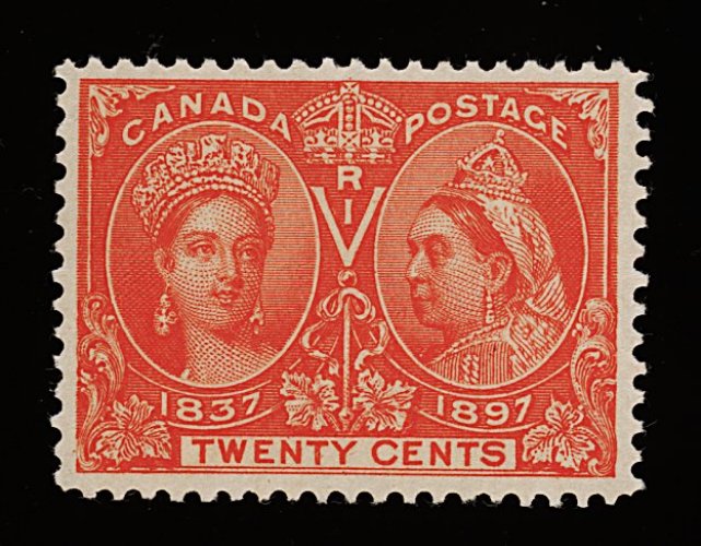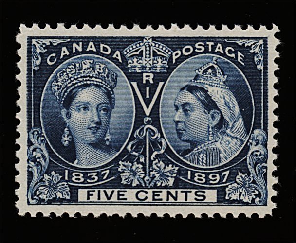 954 nh 54 image#54, 1897 5c Jubilee, extraordinarily well centered within large margins, rich luxuriant color and a deeply etched impression, pristine o.g., n.h., extremely fine; a choice "post office" fresh stamp (Unitrade C$180.00). (Image) 95.00