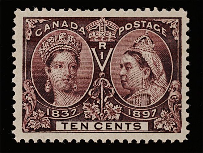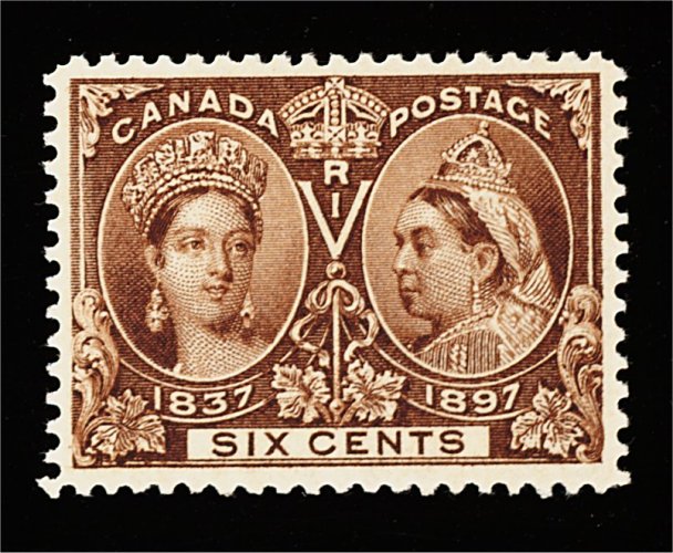 955 nh 55 image#55, 1897 6c Jubilee, highly select mint example, possessing not only outstanding centering within very large margins, but this stamp also features incredibly intense color and a remarkably detailed impression on immaculate paper, o.g., n.h., extremely fine; a very scarce stamp in this pristine gem quality; photocopy of a 1995 PF certificate for a vertical pair, this being the bottom stamp (Unitrade C$900.00). (Image) 450.00