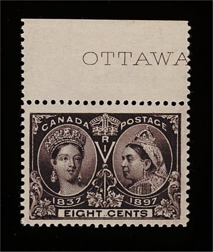 960 nh 60 image#60, 1897 50c Jubilee, a spectacular quality left sheet-margin mint single, possessing an impressive overall brilliance few others enjoy, with gorgeous rich color and a deeply etched impression on bright paper, incredibly well centered amid lavishly large margins, immaculate o.g., n.h., extremely fine; a "post office" fresh gem; photocopy of a 2000 PF certificate for a vertical pair, this being the bottom stamp (Unitrade C$675.00). (Image) 550.00