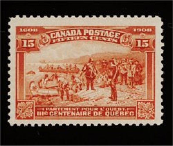 977 nh 102 image#102, 1908 15c Quebec Tercentenary, enormously large margins all around and being quite well centered within them, radiantly rich color on bright fresh paper, immaculate o.g., n.h., extremely fine (Unitrade C$600.00). (Image) 300.00