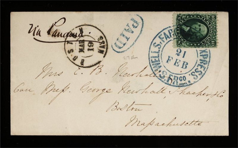 90 c 68 image#68, 10c Yellow green, intensely rich color and natural s.e. at right, tied to an immaculate cover to Boston by a superb complete strike of blue "Wells, Fargo & Co's Express/21 Feb/S.Frco." large double ring c.d.s., matching "PAID" in oval handstamp to left, manuscript notation "Via Panama" at left, choice strike of Boston arrival c.d.s. on front, extremely fine; an extraordinarily fresh and choice Wells, Fargo cover; illustrated in Lester G. Brookman's The United States Postage Stamps of the 19th Century, Volume II (figure 70, page 46). (Image) Est. 500-750