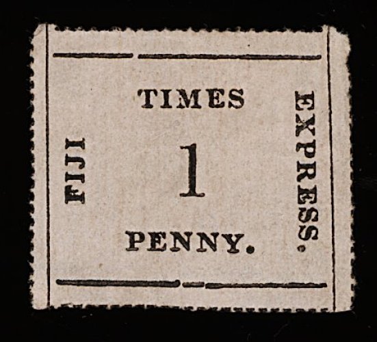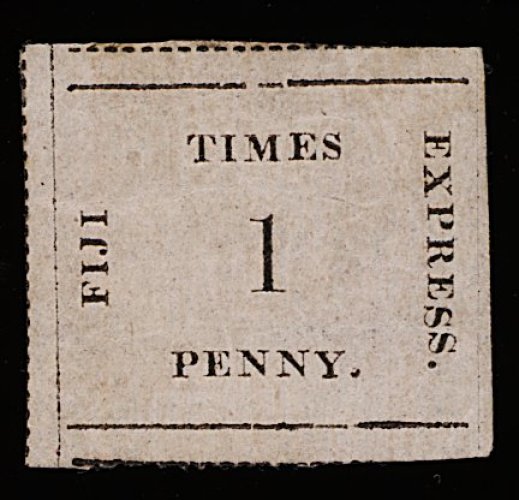 1043 og 6 image#6, 1871 1p Black on rose "Fiji Times Express", mostly full roulettes on three sides, natural straight-edge at right, fresh, nearly full original gum (certificate states "small part o.g."), faint corner crease, otherwise very fine; 2000 BPA certificate (S.G. #5; £900). (Image) 950.00