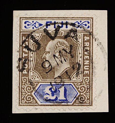 1045 O 69 image#69, 1903 £1 Gray and ultramarine, tied to small piece, very well centered for the issue, neat centrally struck "Suva/9 MY 1912" c.d.s., very fine; a very scarce stamp used (S.G. #114; £375). (Image) 475.00