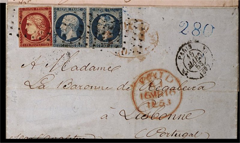 1046 c imageAn interesting selection of 1853-69 covers (6) chosen for external destinations, including Chile, Mexico, Spain, and 1853 entire letter from Paris to Lisbon via London bearing 1849 Ceres 1f (#9c) and 1852 Republic 25c (#11), pair cancelled by "gros points", stamps touched in places, one of the other covers is from Lisbon to Paris bearing Portugal 25r, nice range of rate and route markings. (Image) Est. 750-1,000