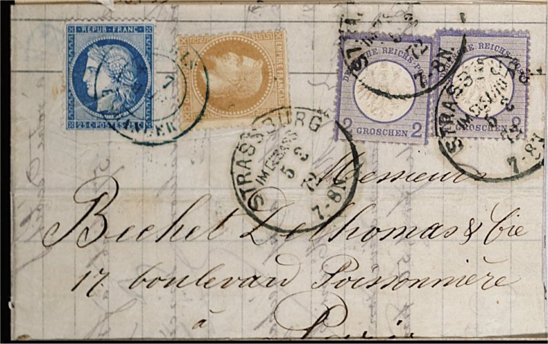1047 c imageAlsace and Lorraine, two entires, one 1871 from Strasbourg to Besancon bearing Occupation 20c ultramarine (#N6), small repair at right, in combination with France 1871 Ceres 25c blue (#58) tied by framed "Strassburg i. Els. / Bahnhof" d.s. and T.P.O. diamond h.s. respectively, and an 1872 entire from Strassbourg to Paris bearing German Empire small eagle 2gr (#5) singles (2) in combination with France 1863-70 Laureated 10c bister (#32) and 1871 Ceres 25c blue (#58), the two French stamps have creases or small spike holes, cancelled by "Strassburg / in Elsass" and blue "Paris / Etranger" c.d.s. respectively, a nice appearing pair of covers illustrating the use of the Occupation and their successor German Empire stamps. (Image) Est. 300-400