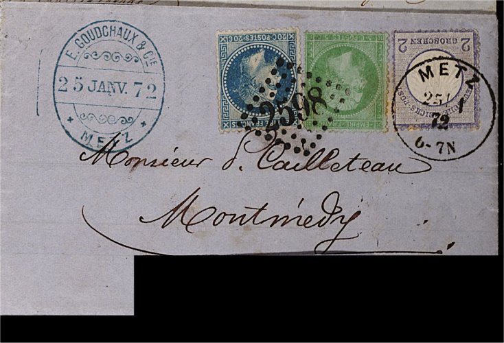 1048 c imageAlsace and Lorraine, Germany 1872 Small Eagle 2gr Ultramarine (#5) cancelled by "Metz" c.d.s. on 1872 (Jan. 25) printed invoice to Montmedy, in combination with France 1862-71 Empire perf. 5c Green (#23) and 1863-70 Laureated 20c (#33), crisply tied by large figures "2598", transit and arrival c.d.s. on reverse, the 5c has blunt corner and there are a few lightly foxed perfs., a very pretty cover. (Image) Est. 200-300