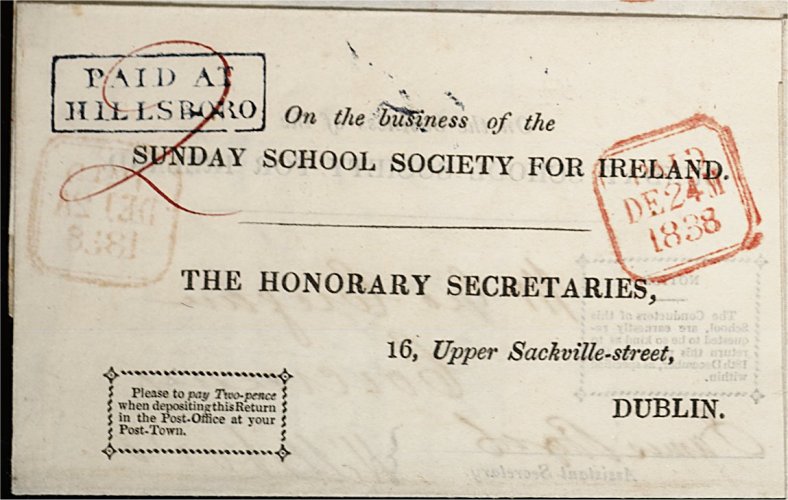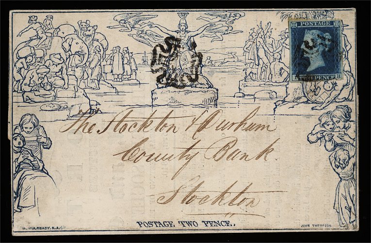 1058 c imageMulready 2p Blue letter sheet with Clerical, Medical and General Director's Report, used in 1844 (Jan. 20) to Stockton (Jan 21) uprated with 1841 2p Blue plate 3 IH, bright color and full to large margins except at foot where slightly rough separation has resulted in "E" of "Pence" being encroached upon, cancelled by Maltese Cross in black with another strike adjacent and matching "Newcastle on Tyne" double arc origin d.s. on reverse, rare and appealing uprated Mulready; 1998 B.P.A. certificate (S.G. Spec. MA3xq; £4,000). (Image) Est. 1,000-1,500