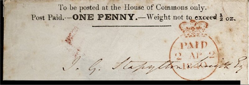 1055 c imageHouse of Commons 1p envelope (issued January, 1840) printed in black to Brigg showing Crowned circle "Paid" d.s. of "2 Ap 1840" in red, endorsed "Worsley", slight age spotting and seal at back excised, nevertheless a highly collectible example of these free franking envelopes for Members of Parliament, which, in actual fact, were the world's first postal stationery envelopes to prepay postage (S.G. Spec. PE5; £1,200) (Image) Est. 400-500