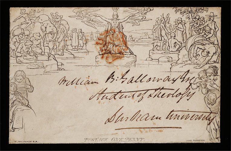 1056 c imageMulready 1p Black envelope forme A178 to Durham cancelled by Maltese Cross in red and showing matching "Liverpool / My 6 / 1840" double arc origin d.s. clearly struck on reverse, the first official day of use, very trivial overall soiling, nevertheless a very fine first day use of the world's first postal stationery envelope for the general public (S.G. Spec. ME2; £4,000). (Image) Est. 1,500-2,000