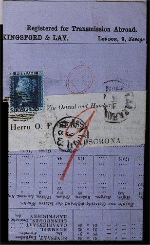 1059 c imageAn interesting selection of 1842-69 franked covers (9) sent abroad, bearing various values with a good range of destinations and rates, including 1842 entires (2) to Lubeck and France each bearing 1p Red (the former damaged but with "Detained for Postage" h.s.), 1848 envelope from Edinburgh to U.S.A. bearing embossed 1/- Green (four margins) additionally tied by handstruck "12" in red, and 1863 wrapper to Sweden bearing 2p Blue, other destinations include New Zealand and Switzerland, some faults. (Image) Est. 500-750