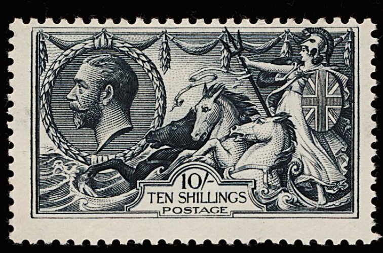 1060 og 181 var. image#181 var., S.G. Spec. N71(3), 1919 10/- Steel blue, Bradbury, Wilkinson printing, a rare mint example of this distinctive shade, possessing intense color and a detailed impression on bright paper, centered to the top, o.g. with only a trace of hinging, nearly very fine; a desirable stamp for the Great Britain or George V specialist; 1998 BPA certificate. (Image) S.G. Spec. 2,500.00