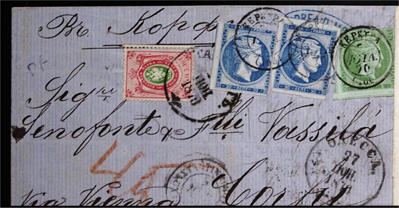 1063 c 31, 34 image#31, 34, 1870 20lep Blue German printing (2) and 1870 5lep green later cleaned plates, large to cut into margins and one 20lep crossed by filing crease, applied as Postage Dues and cancelled by "Kerkyra" arrival c.d.s., on 1870 entire from Taganrog to Corfu via Odessa and the Greek P.O. in Constantinople, franked at origin with Russia 1865 30k Carmine and green (#18) and tied by c.d.s., a very fine and attractive combination cover; signed Calves. (Image) Est. 500-750
