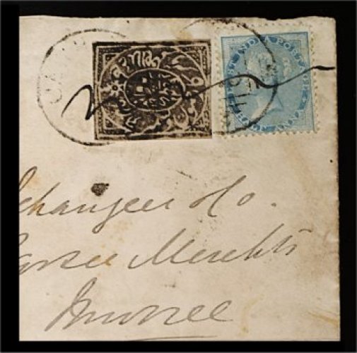 1072 c 64 imageKashmir #64, 1866-70 1/4a Black, in combination with India 1865-67 1/2a Blue (#20,) tied to envelope (flap at back missing) from Jammu to Murree, cancelled by c.d.s. and with pen stroke security mark (S.G. #90 + #55). (Image) Est. 100-150