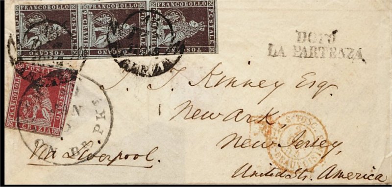 1076 c imageItalian States attractive and desirable postal history assembly of 1851-70 covers (9) nearly all sent within the Austro-Italian League, comprising Austria, Modena, Papal States, Parma (2) with 1853 entire to Milan bearing 5c (#1) and 10c (#2), and 1856 entire to Trieste bearing 1852 25c (#4) and 1853 15c (#7), and Tuscany (3) with 1855 envelope from Genoa to New York bearing 1cr (#4), an enormous example, with 9cr (#8) vertical strip of three, some faults and there are stamps touched or cut into, nevertheless fine appearance with attractive frankings. (Image) Est. 750-1,000