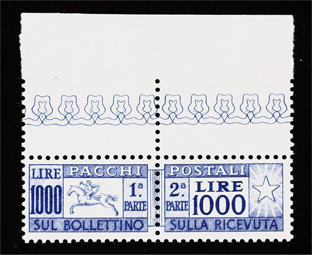 1078 nh Q76 image#Q76, 1954 1,000L Ultramarine Parcel Post, an incredibly choice top sheet-margin mint example of this rare stamp, brilliantly fresh, virtually perfect centering which is terribly difficult to find, o.g., stamp n.h. (l.h. in selvage only), extremely fine (Sassone #81; 8,000,000L). (Image) for hinged 1,300.00