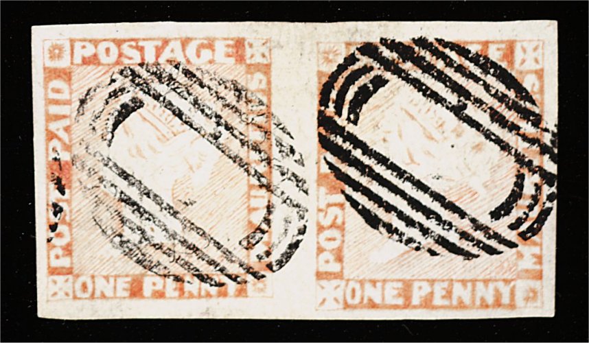 1079 O 3c image#3c, 1848 1p Orange red, worn impression on yellowish white paper, horizontal pair [7-8], bright color, large even margins and two complete strikes of bold barred oval obliterator, extremely fine and choice; a very rare and desirable classic multiple in this premium quality; 1969 PF certificate; ex-Dale Lichtenstein (S.G. #16; £850+). (Image) 750.00+