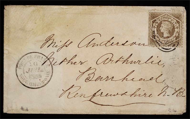1101 c imageNew Caledonia 1890 envelope to Scotland via Glasgow showing fine slightly doubled strike of "Port de France / Nouv. Caledonie" double ring origin d.s. of July 20, 1890, and bearing New South Wales 6p Grayish brown (#68), straight edge at right, tied by "NSW" in concentric ovals, to pay onwards postage to Europe, with circular "Ship Letter / Sydney" d.s. (July 31) and "Glasgow" c.d.s. (Oct. 23) on reverse, lightly soiled not detracting from the magnitude of this exceptionally rare "combination" cover of which only a few examples have survived, a great Oceania rarity; 1994 Calves certificate. (Image) Est. 5,000-7,500