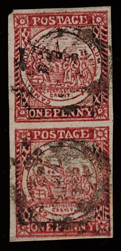 1117 O 2b image#2b, 1850 1p Carmine, Plate II on yellowish laid paper, superb horizontal pair [11-12], bright color, huge even margins, neat oval barred obliterator cancellations, extremely fine; 1996 Royal Philatelic Society of Victoria certificate (S.G. #13; £950+). (Image) 900.00+