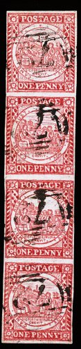 1119 O 2c, 2g image#2c, g, 1850 1p Crimson-lake, Plate II on bluish paper, a magnificent vertical strip of four [5/10/15/20], [15] is the "no clouds" variety, deep rich color is highlighted by the perfectly sustained blueing of the paper, large margins all round, cancelled "72" (Wee Waa), extremely fine and an important multiple (the largest recorded being a horizontal strip of five, and this is probably the largest surviving vertical strip), a true gem for the connoisseur; 1994 Royal Philatelic Society of Victoria certificate; ex-Ferrary and Burrus (S.G. #9, c; £1,675+). (Image) Est. 1,500-2,000