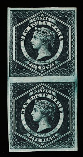1141 og 65a image#65a, 1882-91 5p Dark blue green, imperforate, mint vertical pair, gorgeous color, large even margins, o.g., extremely fine (S.G. #233e; £200). (Image) 225.00