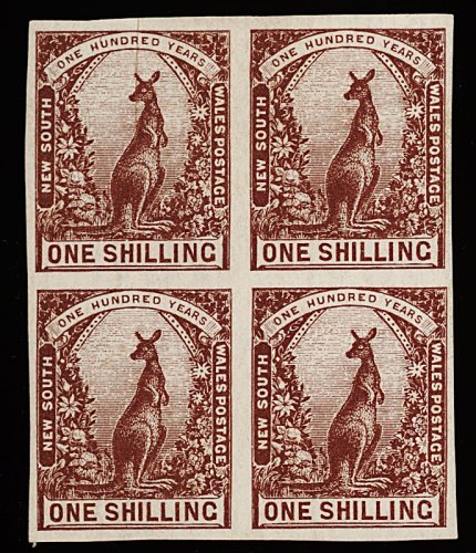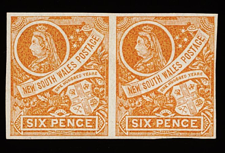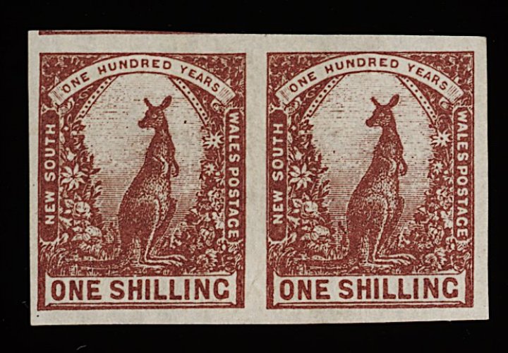 1142 og 82a image#82a, 1888-89 1/- Violet brown, Centenary of New South Wales, imperforate, horizontal pair, large margins all round showing portion of adjoining stamp, much o.g., very fine and a rare imperforate variety; 1978 R.P.S. certificate (S.G. #258ca; £550). (Image) 725.00+