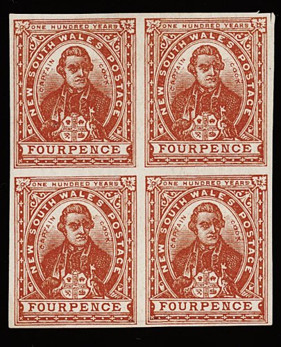 1145 ogbl 104Bc image#104Bc, 1899 4p Red brown, chalk-surfaced paper imperforate, mint block of four, full to large margins, o.g., very fine and fresh; 1985 R.P.S. certificate (S.G.#303bc; £400+). (Image) 600.00