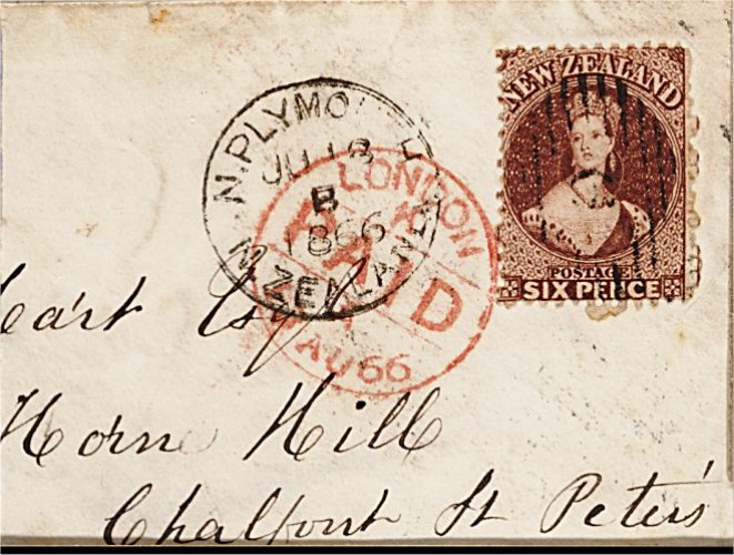 1149 c 36 image #36, 1864-67 6p Red brown watermark star, perf. 12 1/2, on 1866 (June 18) envelope (roughly opened at back) to England "via Melbourne + Southampton", cancelled "9", showing "N. Plymouth / N. Zealand" origin and "London / Paid" transit (Aug. 13) c.d.s. in red, with arrival c.d.s. (Aug. 14) on reverse, fine (S.G. #122). (Image) Est. 100-150