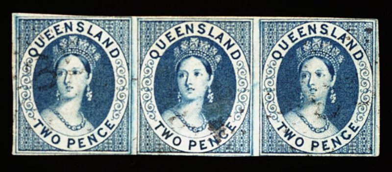 1181 O 2 image#2, 1860 2p Deep blue imperforate, an exceedingly rare used horizontal strip of three, lovely warm shade and light cancellations leaving Queen's heads practically free, ample to large margins, extremely close to fractionally touching at foot of 2nd and 3rd stamps, otherwise fine and an important multiple; a strip of three being the largest recorded unit for this value; 1980 R.P.S. certificate (S.G. #2; £4,500+). (Image) 6,750.00+